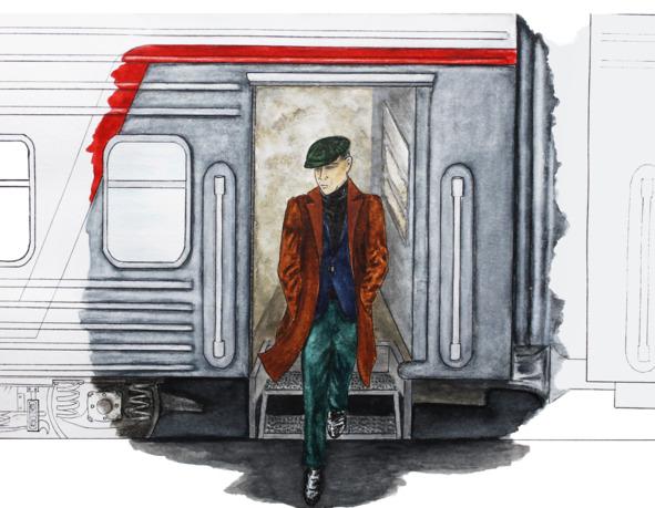 В окне начали появляться редкие кирпичные здания. В скором времени они захватили весь вид. Поезд двигался в черте города, плавно сбрасывая скорость. За окном медленно проплывала серая бетонная платформа. На ней небольшими группами собрались люди. Стояло раннее утро, солнце уже светило. На улице было свежо. Вагон почти полностью был заполнен людьми. Запах сигаретного дыма витал в воздухе. Примерно в середине вагона сидел мужчина средних лет. Длинное коричневое пальто и головной убор в руках выделяли его на фоне остальных. Он сидел с краю. Вид у него был слегка встревоженный. По не очень здоровому лицу было заметно, что он с нетерпением дожидался остановки. Поезд плавно замедлял ход. Мужчина посмотрел на своего попутчика напротив. Надев головной убор, он улыбнулся и почтительно кивнул. Вагон дёрнулся — движение за окном остановилось. Лишь люди, подходящие к вагону, нарушали статичность картины. Человек, сидевший напротив, провожал выходящего пассажира взглядом. В руках он держал приоткрытую книгу.