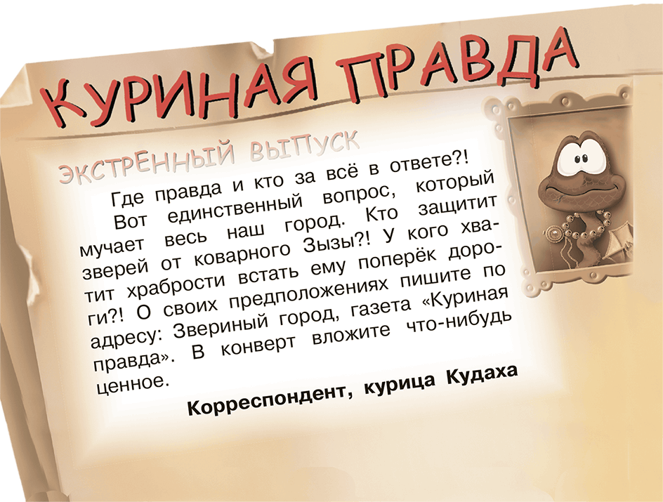 На город опустилась ночь. Все попрятались по своим жилищам, позакрывали окна и двери, погасили свет, словно и не жил никто в Зверином городе вовсе. А всё потому, что где-то меж домов крался коварный Зыза и готовился к новому преступлению!