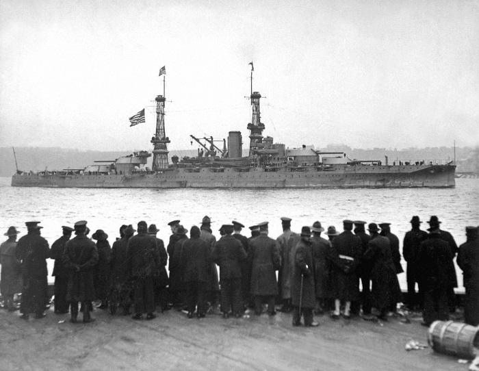 На торчащих из воды гиперболических мачтах (башнях) полузатопленных линкоров хорошо видны РЛС кругового обзора, которые так и не смогли предупредить о налете японской авиации.