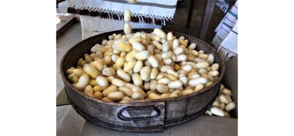 и образцы коконов в музее. Тутовый шелкопряд разводили на Кипре десять веков назад. Многие семьи и даже школы подкармливали шелковичных гусениц. Из письменных источников известно, что на Кипре производилось 150 тонн шёлка. Из шёлка ткали парадную одежду, а оставшуюся его часть экспортировали в Европу. Шелкопряд живёт только с апреля по июнь и питается листьями тутового дерева (лат. Morus), или вавациньи по-кипрски. После выведения яйца шелкопряда выкладываются на подстилку из камыша. В какой-то момент гусеница перестаёт питаться и начинает искать место для формирования кокона, на что у неё уходит неделя. К этому времени шелковичная железа, которая производит шёлковую нить, составляет почти половину от массы её тела. Затем червячок делает дырочку в коконе и вылезает наружу в виде мотылька. Мотылёк не улетает, спаривается с другими особями, откладывает яйца, которые хранятся в тёмном месте до образования нового цикла жизни. Самые лучшие коконы хранятся в темноте, тогда как коконы похуже держат на солнце в течение двух дней до умирания гусениц и размягчения клейковины кокона. Из десяти килограммов коконов получается более одного килограмма шёлка.