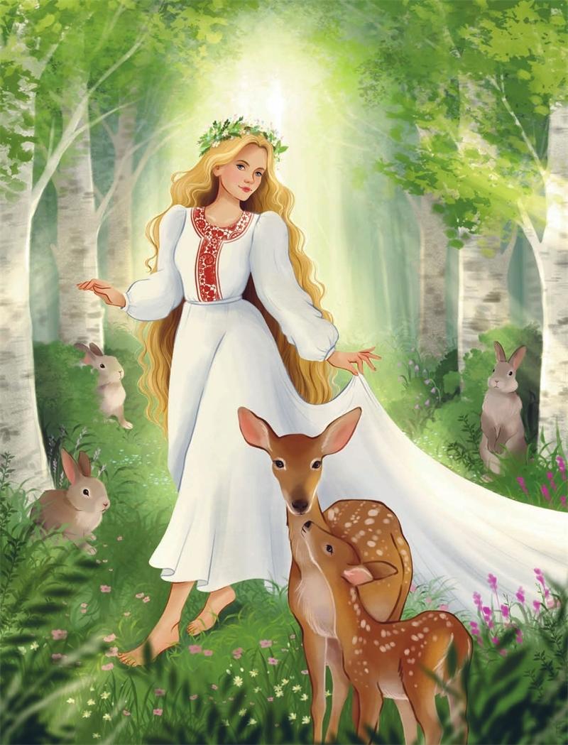 Застучали весёлые весенние капели, будто радостно забилось большое сердце Земли в предчувствии торжества обновления. На потрескавшемся насте образовались наполненные водой ямки – следы, где прошёл огнедышащий конь. Восседает на нём молодая наездница. Вся она из себя ладная, быстрая. В руке сжимает красавица алые, как угли, грозди калины. С птицами и травами она в ладу. Ждут всадницу с нетерпением и зверушки. За месяцы холода соскучилось по её теплу, ласке да заботе всё живое. Эта чудной красоты богиня и с людьми в мире и согласии. Более того! Учит она их, как ладить между собой. Знает, какой парень нашёл свою – ладушку, любимую. Дружит она с богиней судьбы Мокошь. Так что легко ей две дороги в одну связать, пару сердец общим огнём наполнить. Она – богиня любви, красоты и плодородия Лада.