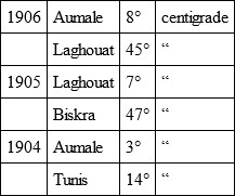 The temperature in the desert frequently changes with a suddenness that would be remarked in Paris, the place par excellence in Europe where the changes in temperature are most trying; or in Marseilles, where, from a subtropical summer sun, one can be transplanted on the breath of the mistral into the midst of an Alpine winter in the twinkling of an eye. Fifty degrees centigrade at high noon in the desert may be followed by ten degrees at midnight. That’s a change of seventy-two degrees Fahrenheit, and that’s something.