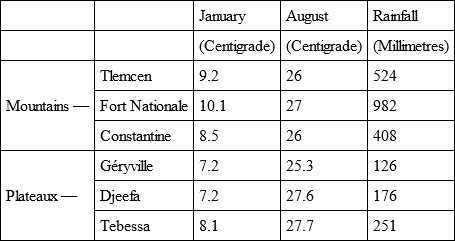 As compared with the temperature of the French Riviera, taking Nice as an example, the balance swings in favour of Algeria in winter, and a trifle against it for summer, as the following figures show: —