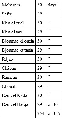 The Mussulman calendar is simple, and, except in the nomenclature of its divisions, is not greatly different from our own. The Arab year has twelve lunar months, making in all three hundred and fifty-four or three hundred and fifty-five days.