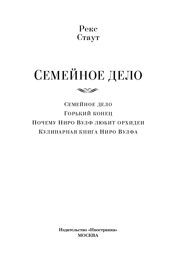 Семейное дело : роман, повесть, эссе / Рекс Стаут ; пер. с англ. К. Королева, А. Санина, О. Александровой, Т. Чернышевой. — М. : Иностранка, Азбука-Аттикус, 2023. — (Иностранная литература. Классика детектива).