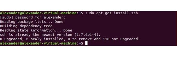 3) Прописать команду sudo apt-get install ssh (Рисунок 2) Ввести пароль sudo если потребуется;