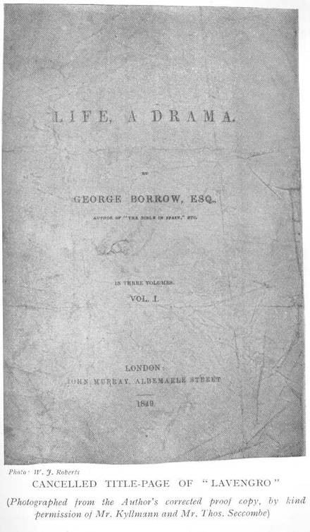“Life, a Drama,” was to have been published in 1849, and proof sheets with this name and date on the title page were lately in my hands: as far as page 168 the left hand page heading is “A Dramatic History,” which is there crossed out and “Life, a Drama” thenceforward substituted. Borrow’s corrections are worth the attention of anyone who cares for men and books.