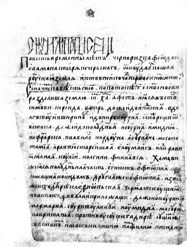 ЛЕТОПИСЩИК вкратце О РУСКОЙ ЗЕМЛЕ, ОТ КОТОРОГО КОЛЕНА РОСИСКИЯ И СЛОВЯНСКИЯ ЛЮДИ, и почему именуется Росия и словяне, и о создании Великаго Нова града, И ОТКУДУ ВЛЕЧАШАСЯ РОД СЛОВЯНСКИХ КНЯЗЕЙ. НАЧНЕМ ЖЕ ЗДЕ ОТ НАЧАЛА, ЕЖЕ ЕСТЬ СЕ: