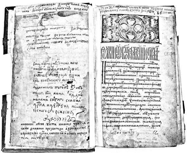 Кстати, обратите внимание, что «киевский черноризец» попытался было написать первую строку русской вязью – как это было принято в русских рукописях того времени – но сделал это крайне неумело. Для сравнения на рис. 2 мы приводим страницу из подлинной старинной русской рукописи, где первая строка написана настоящей вязью.