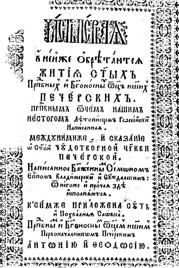 Рис. 3. Титульный лист первой части «Жития Печерских святых», напечатанных в Киево-Печерской Лавре при архимандрите Иоасафе Кроковском на рубеже XVII–XVIII веков. Написано следующее: «ЧАСТЬ ПЕРВАЯ в ней же обретаются ЖИТИЯ СВЯТЫХ ПЕЧЕРСКИХ ПРЕПОДОБНЫМ ОТЧЕМ НАШИМ НЕСТОРОМ Летописцем Российским Написанная…».