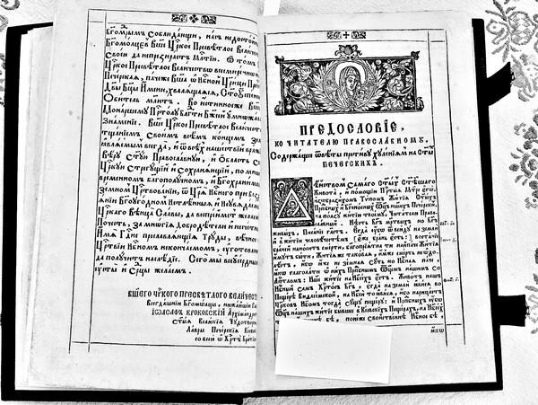 Рис. 4. Первые страницы «Жития Печерских святых», напечатанных в Киево-Печерской Лавре при архимандрите Иоасафе Кроковском: конец посвящения Петру I и начало Предисловия к православному читателю, содержащего ответы «противу хулениям на святых печерских».