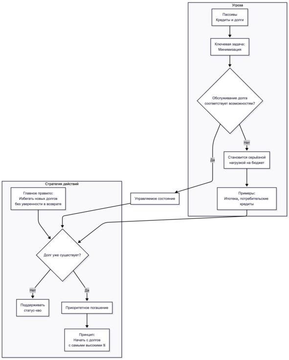 Что касается пассивов, то здесь ключевым моментом является их минимизация. Ипотечные кредиты или потребительские кредиты могут стать серьёзной нагрузкой на бюджет, если их обслуживание выходит за рамки ваших возможностей. Чтобы избежать этого, стоит избегать долгов, если у вас нет уверенности, что вы сможете их вернуть. Если долг всё же существует, важно приоритетно его погашать, начиная с самых высоких процентов.