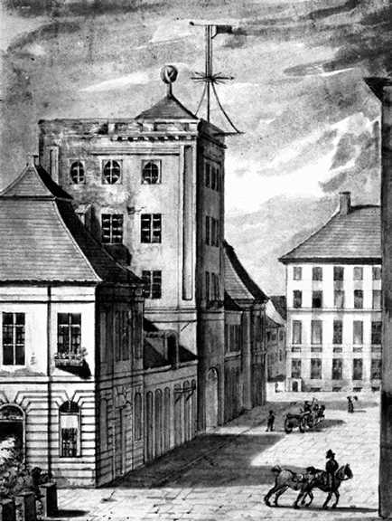 Впрочем, касательно ситуации в Берлине следует сделать пояснение. Указ о создании там академии и обсерватории подписал в день своего рождения, 11 июля 1700 года, бранденбургский курфюрст Фридрих III. Активное участие в ее организации принял Лейбниц, который стал ее первым президентом. В момент основания академия получила название Курфюршеское Бранденбургское научное общество (Kurfürstlich-Brandenburgischen Societät der Wissenschaften). В следующем году Общество было переименовано в Королевское Прусское научное общество (Königlich Preußische Sozietät der Wissenschaften), поскольку курфюрст Фридрих III стал в этом году прусским королем Фридрихом I. В 1744 году при Фридрихе II Общество было реорганизовано в Королевскую Прусскую академию наук (Königlich-Preußische Akademie der Wissenschaften). Упомянутые выше конюшни на 200 лошадей были построены на улице Унтер-ден-Линден в 1687–1688 годах по проекту архитектора Иоганна Арнольда Неринга (Johann Arnold Nering; 1659–1695). В 1696–1700 годах по проекту архитектора Мартина Грюнберга (Martin Grünberg; 1655–1706) здание было расширено почти в два раза для размещения в нем научного Общества. В 1700–1711 годах в северном крыле этого здания была сооружена 27‐метровая башня с тремя дополнительными этажами. В ней в январе 1711 года состоялось официальное открытие Обсерватории. Таким образом, в Берлине, как и в Петербурге, научное учреждение располагалось поначалу в одном здании с обсерваторией, библиотекой и кунсткамерой.