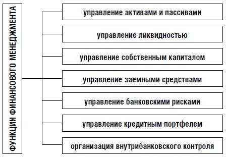 Функции банковского менеджмента связаны с основными направлениями – управлением финансовыми потоками и трудовыми ресурсами. Составными частями менеджмента в банке являются финансовый менеджмент и кадровый менеджмент, но есть и другие направления – управление материальными активами, фондами банка, которые имеют второстепенную роль.