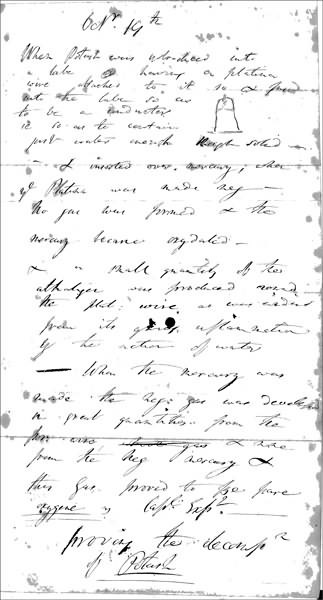 October 19.—It is probable that, in consequence of the property which the unknown substance displayed of amalgamating with mercury, he devised his experiment of the 19th. He took a small glass tube, about the size and shape of a thimble, into which he fused a platinum wire, and passed it through the closed end. He then put a piece of pure potash into this tube, and fused it into a mass about the wire, so as entirely to defend it from the mercury afterwards to be used. When cold, the potash was solid, but containing moisture enough to give it a conducting power; he then filled the rest of the tube with mercury, and inverted it over the trough: the apparatus being thus arranged, he made the wire and the mercury alternately positive and negative. And now, conceiving that I have sufficiently explained his brief notes, the reader shall receive the result in his own words: for this purpose I have obtained an engraving of the autograph, which is here annexed; but as it may not be very readily deciphered, I shall first give the substance of it in print.—"When potash was introduced into a tube having a platina wire attached to it—so—and fused into the tube so as to be a conductor, i. e. so as to contain just water enough, though solid, and inserted over mercury, when the platina was made negative, no gas was formed, and the mercury became oxydated, and a small quantity of the alkaligen was produced round the platina wire, as was evident from its quick inflammation by the action of water. When the mercury was made the negative, gas was developed in great quantities from the positive wire, and none from the negative mercury, and this gas proved to be pure oxygene—A Capital Experiment, Proving the Decomposition of Potash." The Reviewer of the Institution Journal well observes that those who knew Davy will best conceive the enthusiasm with which this hasty record of his success was dashed off, and will instantly recognise ευρηκα in his "Capital Experiment."