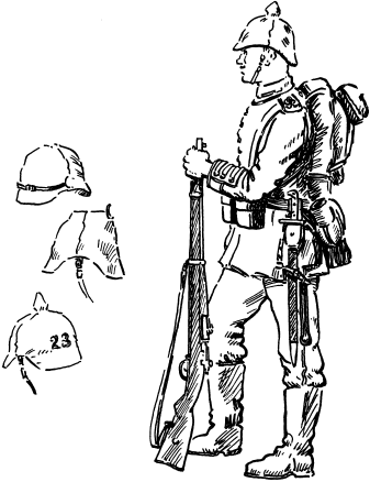 Пехотинец 1914 года в форме серо-стального цвета и островерхой каске, обтянутой холстиной