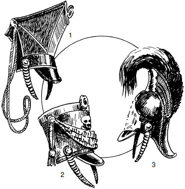 Офицерские головные уборы 1831 года: 1 – уланский кивер; 2 – гусарский кивер; 3 – каска кирасира