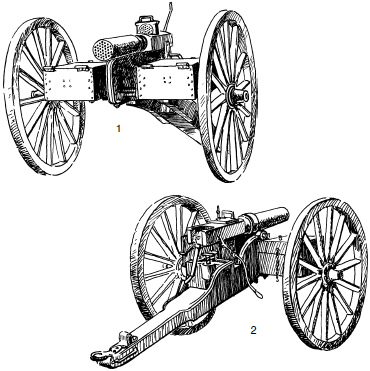 Митральеза (картечница): 1 – вид спереди; 2 – вид сзади