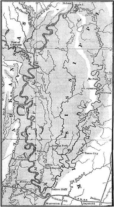 At a few points of the banks high land is encountered. On the right, or western, bank there is but one such, at Helena, in the State of Arkansas, between three and four hundred miles below Cairo. On the left bank such points are more numerous. The first is at Columbus, twenty-one miles down the stream; then follow the bluffs at Hickman, in Kentucky; a low ridge (which also extends to the right bank) below New Madrid, rising from one to fifteen feet above overflow; the four Chickasaw bluffs in Tennessee, on the southernmost of which is the city of Memphis; and finally a rapid succession of similar bluffs extending for two hundred and fifty miles, at short intervals, from Vicksburg, in Mississippi, about six hundred miles below Cairo, to Baton Rouge, in Louisiana. Of these last Vicksburg, Grand Gulf, and Port Hudson became the scenes of important events of the war.
