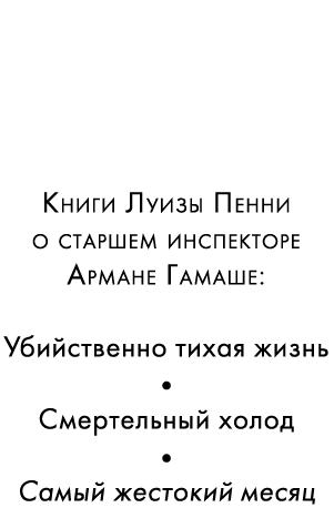 Роман «Самый жестокий месяц» продолжает серию расследований блистательного старшего инспектора Армана Гамаша — нового персонажа, созданного пером Луизы Пенни, единственного в мире пятикратного лауреата премии Агаты Кристи.