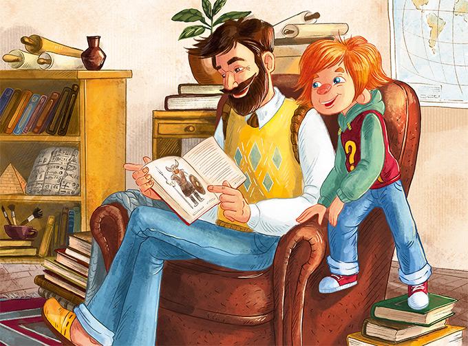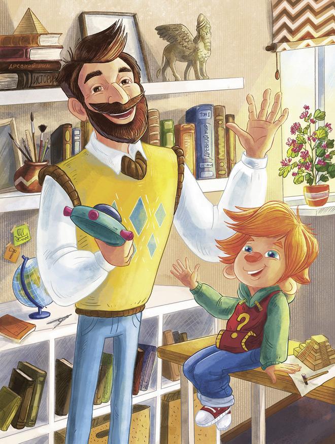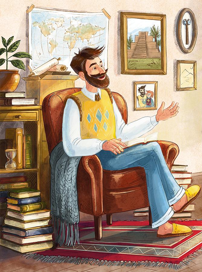 Здравствуйте, ребята! Меня зовут Чевостик. Я живу на книжной полке в библиотеке у дяди Кузи. Не удивляйтесь: я небольшого роста, а нижняя полка в книжном шкафу у дяди Кузи очень высокая и просторная, поэтому мне на ней хорошо и удобно. Какой я? Похож на обыкновенного мальчишку, волосы рыжие, характер весёлый. Дядя Кузя в шутку зовёт меня Чевочкой с хвостиком. Но никакого хвоста у меня нет, зато есть ушки на макушке. Больше всего на свете я люблю узнавать новое, поэтому всё время задаю всякие вопросы дяде Кузе. О чём бы я ни спросил, он всё знает и мне рассказывает. Это потому, что дядя Кузя очень умный. Он прочитал много-много разных книг. А ещё мы с ним любим путешествовать! В путешествии нам помогает времяскок. Это такой прибор, его дядя Кузя изобрёл. Набираешь на времяскоке место и время, куда хочешь попасть, раз, два — и уже там! Сегодня мы наверняка тоже куда-нибудь отправимся!