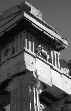 Деталь храма Афины Парфенос (Афины-девы). Хорошо видно устройство антаблемента. Непосредственно на колонны опираются балки архитрава, выше расположен фриз, составленный из метоп и триглифов. Над ними нависает карниз. Для лучшей сохранности метопы были заменены копиями. Подлинники хранятся здесь же, на Акрополе, в специальном музее.