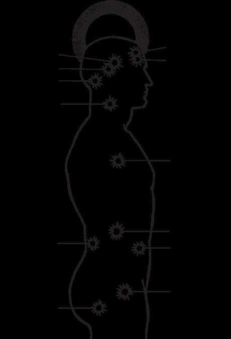 Вековые секреты исцеления говорят, что у каждого из нас есть 12 сил сознания и расположены они в нашем теле в следующих жизненно важных нервных центрах и железах. Как показано на рис. 1.