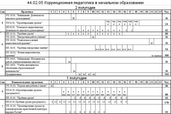 Ниже представлен перечень всех практик на примере учебного плана специальности 44.02.05 Коррекционная педагогика в начальном образовании, реализуемого ГБПОУ «Михайловский профессионально-педагогический колледж имени В.В.Арнаутова».