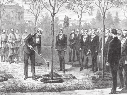Александр II сажает дубок в Александровском саду. Гравюра Э. Дамюллера с рисунка К. Брожа. 1874 г.