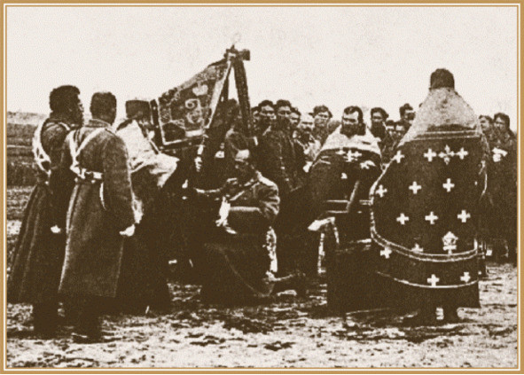 Освещение нового Георгиевского знамени 10 Донского полка. 26 февраля 1914 год. Священник отец Бокаревич передаёт знамя временно командующему Варшавским округом генералу от кавалерии Траубенбергу