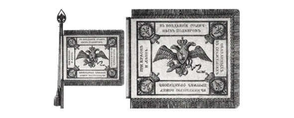 Высочайшим приказом 13 января 1816 г.за героизм в сражениях при Вязьме, Краоне, Лаоне и Арсисе, было указано вручить простые знамена донским казачьим полкам. Но изготовление этих знамён затянулось, и только в 1817 году император Александр 1 утвердил рисунок для этих знамен (размеры как у Лейб Гвардии Драгунских, но «делать не из штофа, а из материи, из которой делаются оные для пехоты». ) Однако, изготовлены эти знамена были и вручены полкам только в 1821 году. Знамена эти были белого цвета, с палевыми углами, с золотыми орлами, вензелями, ветвями, коронами и полосками. У простых знамен надписи в два ряда – «ВЪ ВОЗДАЯНIЕ ОТЛИЧНЫХЪ ПОДВИГОВЪ ОКАЗАННЫХЪ ВЪ СРАЖЕНIЯХЪ ВЪ МИНУВШУЮ ВОЙНУ ПРОТИВЪ ФРАНЦУЗОВЪ ПРИ КРАОНЕ И ЛАОНЕ.». Бахрома на знамёнах была золотая.