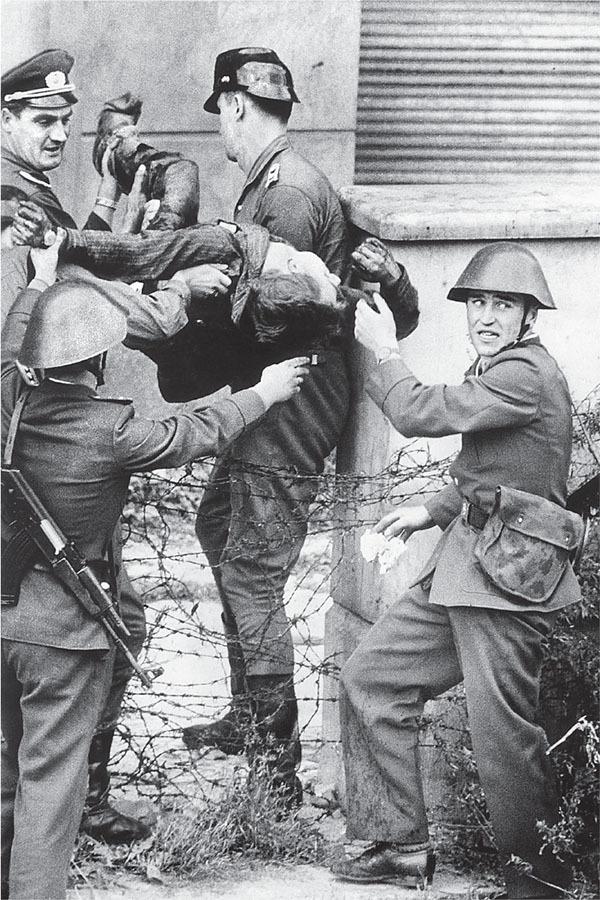 Другая фотография (стр. 35) была сделана 17 августа 1962 года. На ней офицер что-то приказывает солдатам, которые держат тело раненого Петера Фехтера, пытавшегося бежать из Восточного Берлина в Западный. По пути в больницу он умер от потери крови.