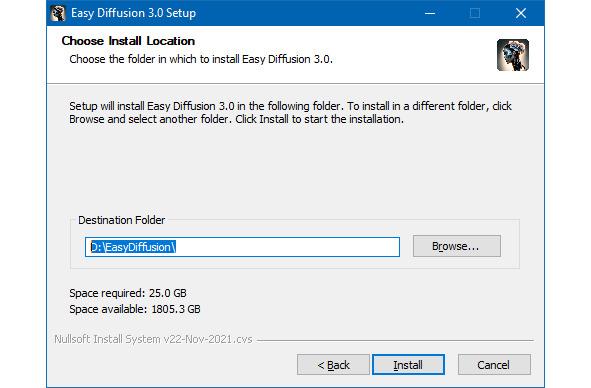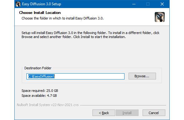 — The minimum amount of disk space (either on the «C:\” drive or on any other drive) is 40 Gigabytes (25 for Easy Diffusion and 15 for models). I recommend installing the program on a computer flash drive (not an external drive, but an internal drive of a computer or laptop). It will make image creation faster.