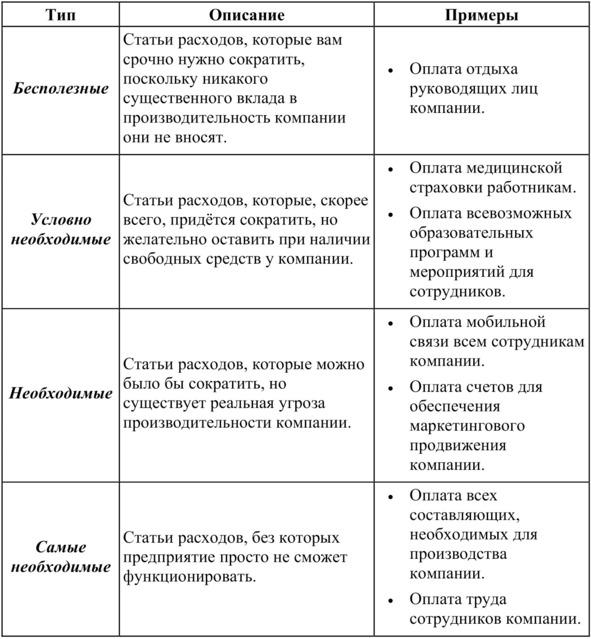 • А теперь самое важное — действия, которые приведут к внедрению системы сокращения издержек. Ниже (см. таблица 1) мы представили приблизительную схему статей расходов, которые есть у многих компаний, во всяком случае, были у всех компании, с которыми нам приходилось работать. Это нужно для того, чтобы ответить на вопрос: «Как быстро мы можем прекратить финансирование статей расходов, которые оказались невостребованной роскошью для нашей компании?».