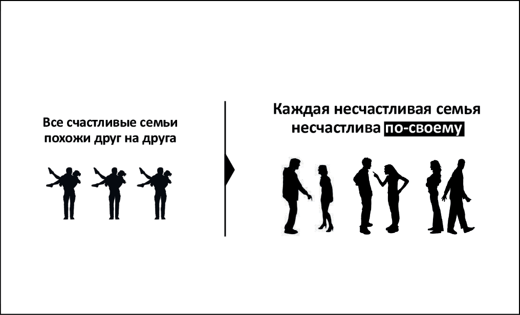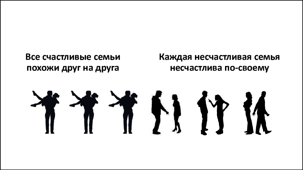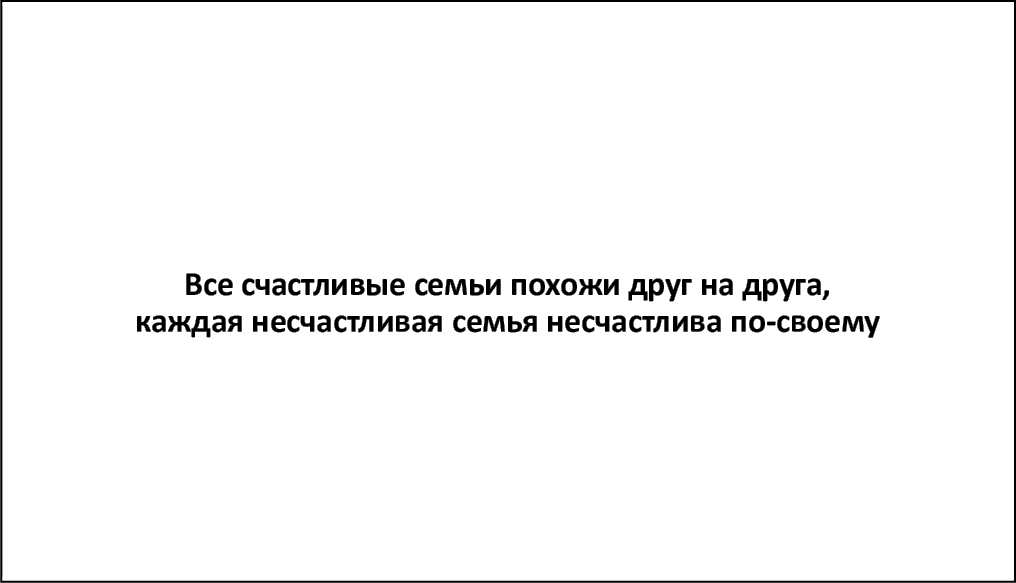 Где бы в реальной жизни толстовская цитата могла появиться? Например, в докладе студента-психолога или популярной лекции психотерапевта, работающего в центре семейной терапии. Допустим, наш вымышленный спикер хочет рассказать о том, что разным парам в зависимости от их проблем и типов личности подходят разные психотерапевтические школы и техники. Кому-то – когнитивно-поведенческая, кому-то – гештальт-терапия, а кому-то – транзактный анализ. Фраза, которую он выбрал для начала разговора, безусловно, вызовет понимающую улыбку у слушателей. Но как сделать слайд выразительнее, интереснее?