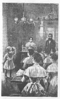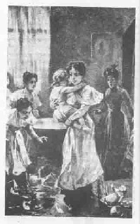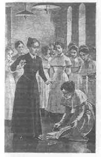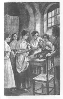Есть между ними и бельевые и гардеробные девушки, то есть такие, которые шьют белье институткам и перешивают им платья. Эти девушки-швеи с утра до ночи просиживают, согнувшись, над шитьем. Тяжела жизнь таких служанок; за полтора — два рубля в месяц они должны работать целые дни. Правда, казна одевает их, дает им от себя платье, белье, обувь, все, до последнего куска мыла включительно, но за это как много они трудятся!