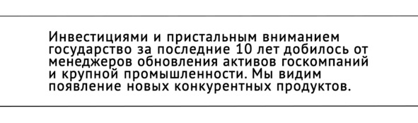 За последние 10 лет государственные инвестиции привели к обновлению производственных активов госкомпаний и появлению новых конкурентных продуктов. Развиваются спутниковые технологии, радиоэлектронные системы, обновляется линейка оборудования для нефтегазовой промышленности и строительства инфраструктуры.