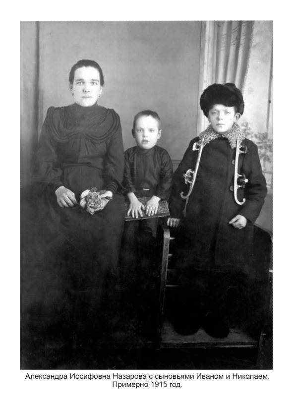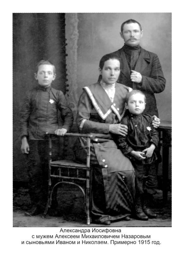 Отца, Назарова Алексея Михайловича, я помню очень плохо, он занимался революцией и часто отлучался в тайные командировки. Отец наш вырос в бедной рабочей семье, его отец работал кочегаром. У отца было ещё два брата и две сестры младше его. Матушка Александра Иосифовна тоже была малограмотна, но много читала. Сама она тоже проучилась до двенадцати лет, и потом её отдали в портновское ученье. И с тех пор она с этим ремеслом не расставалась. Следует отметить, что в те годы тяга к учёбе была не в моде, и ремесло было главным достоинством человека. Поэтому и наша мать едва проучившись три зимы, ушла в ремесло. И уже в шестнадцать лет стала мастерицей портного дела. Кроме того, отец и братья матери были сапожниками, и мать наша умела немного чеботарить. Так что мне было у кого учиться уму-разуму. Наша мать была вторая, по возрасту, первым был брат Константин. Она выросла в многолюдной семье сапожника, их было четыре брата и четыре сестры. И когда они подросли до зрелости, то гуляли по вечерам в четыре пары, не узнаваемые и не мало поражали окружающих, что они все одной семьи. Жили они справно, ремесло сапожника всегда и всем потребно, поэтому нужды они не испытывали. Отец и четыре брата, ставшие тоже сапожниками, обеспечивали сытую жизнь. Мать за нашего отца вышла замуж против воли своих родителей, тогда это называлось «убегом».