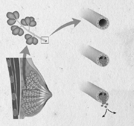 Поэтому они и имеют строение, обеспечивающее выполнение этой функции. Молочные железы расположены на грудной клетке на уровне 3–6 ребер на поверхности большой грудной мышцы. Они являются видоизмененными потовыми железами и сохраняются у мужчин в рудиментарном виде на протяжении жизни. У женщин же с началом полового созревания происходит их увеличение. Наибольшего развития и размера грудные железы достигают на последнем месяце беременности, но полноценное выделение молока начинается только в послеродовом периоде. Каждая молочная железа половозрелой женщины состоит из железистой ткани, которая разделена жировой и соединительной тканями. Прослойки плотной соединительной ткани разделяют всю железу на 15–20 долей, каждая из которых разделена в свою очередь на более мелкие дольки. Все пространство между долями заполнено жировой тканью, которой также много у основания железы (в месте прикрепления ее к грудной клетке). От количества жировой ткани зависит размер и объем грудных желез. Соединительная же ткань крепит железы к мышцам грудины и удерживает ее на месте, не позволяя сползать вниз. Именно от ее прочности и упругости зависит форма груди, а также ее расположение и внешний вид – более высокая или же отвислая. Сама железистая ткань грудных желез состоит из множества отдельных млечных железок, расположенных в дольках железы. Млечные железки в свою очередь состоят из ветвящихся трубочек, которые имеют расширения на концах. Эти расширения имеют вид микроскопических пузырьков и называются альвеолами. В альвеолах, являющихся секреторными отделами железок, образуется молоко, которое выводится трубочками.