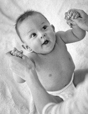– И. п. – то же. Нужно вложить свои указательные пальцы ребенку в ладошки. Он при этом должен хорошо ухватиться за них, прочно их удерживать, а затем совершить попытку приподнять голову и плечи.