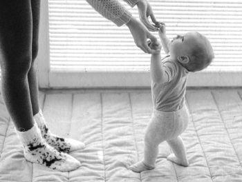 – И. п. – малыш стоит на столе, взрослый человек поддерживает его подмышки. Имитируйте поступательные движения, держа ребенка сначала под ручками, затем за кисти обеих рук, а позже – за одну ручку. Делать эти упражнения нужно только в том случае, если ребенок уже умеет самостоятельно стоять, держась за опору. Такие действия готовят малыша к ходьбе.