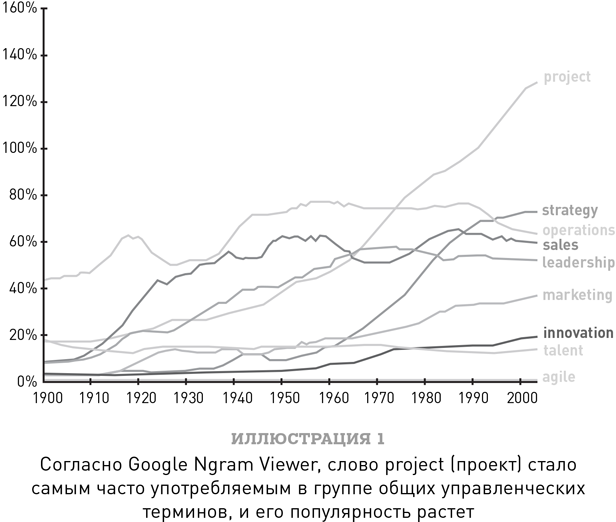Проекты набирают ход. Иллюстрация 1 показывает этот грандиозный, но незаметный сдвиг. График, построенный с помощью онлайн-сервиса Google Ngram Viewer5, демонстрирует, насколько часто англоязычное слово project (проект) встречается в огромном корпусе текстов из печатных источников 1900–2000 гг. по сравнению с другими распространенными терминами в сфере управления и бизнеса, такими как strategy (стратегия), operations (операции), sales (продажи), leadership (лидерство), marketing (маркетинг), innovation (инновации) и talent (талант). Это и есть то, что я называю проектной революцией.
