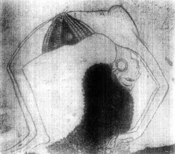 A RELIEF UPON THE SIDE OF THE SARCOPHAGUS OF ONE OF THE WIVES OF KING MENTUHOTEP III., DISCOVERED AT DÊR EL BAHRI (THEBES). THE ROYAL LADY IS TAKING SWEET-SMELLING OINTMENT FROM AN ALABASTER VASE. A HANDMAIDEN KEEPS THE FLIES AWAY WITH A BIRD'S-WING FAN.