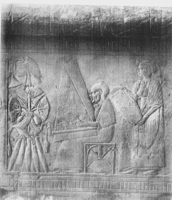 A RELIEF OF THE SAITIC PERIOD, REPRESENTING AN OLD MAN PLAYING UPON A HARP, AND A WOMAN BEATING A DRUM. OFFERINGS OF FOOD AND FLOWERS ARE PLACED BEFORE THEM