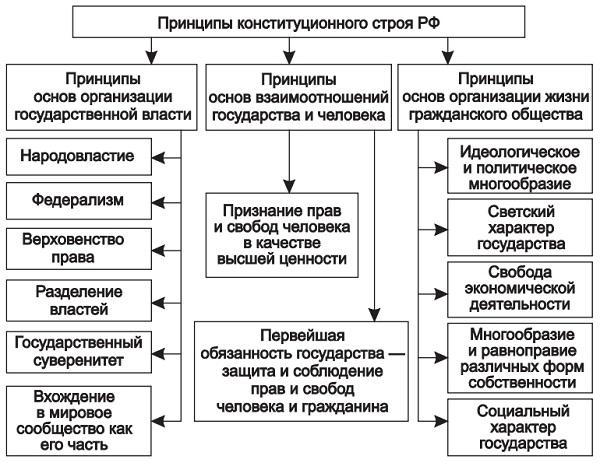 Конституция РФ состоит из 9 глав, и первая из них посвящена конституционному строю. Установление конституционного строя начинается с определения принципов организации государства в его соотношении с личностью и гражданским обществом. Эти принципы как раз и составляют содержание главы 1 Конституции РФ. Они имеют наивысшую юридическую силу. Принципы организации государства закрепляются здесь в самой общей форме, они создают фундамент конституционного строя, а конкретно раскрываются в последних главах Конституции РФ, и поэтому некоторые положения как бы гарантированы дважды (федерализм, право собственности, разделение властей и др.). Нормы-принципы, включенные в главу «Основы конституционного строя», составляют определенную систему и раскрывают: