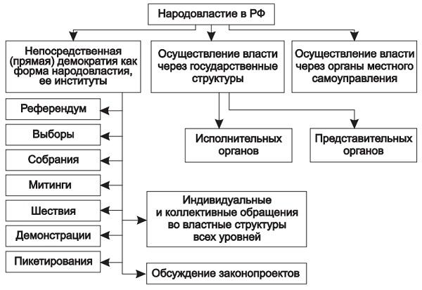 — непосредственно. Эта форма подразумевает прямое волеизъявление народа по вопросам государственной или общественной жизни. Высшая форма непосредственного выражения власти народа — референдум или свободные выборы. Данная форма имеет юридически значимый результат (общеобязательность решения). Возможны и другие формы, не имеющие столь значимых последствий (собрания, митинги, шествия, обращения, всенародные обсуждения законопроектов и др.);