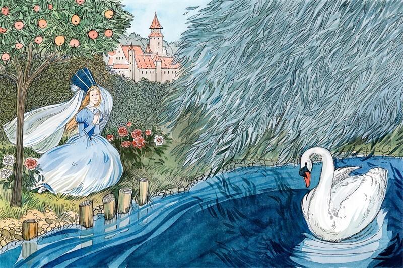Сказано – сделано. Плавая по глади хрустального пруда, лебедь-королевич запел. Королевская дочка Лида как раз смотрела в окно. «Чей это сладкий голос? – подумала она. – Кто же так прекрасно поёт?»