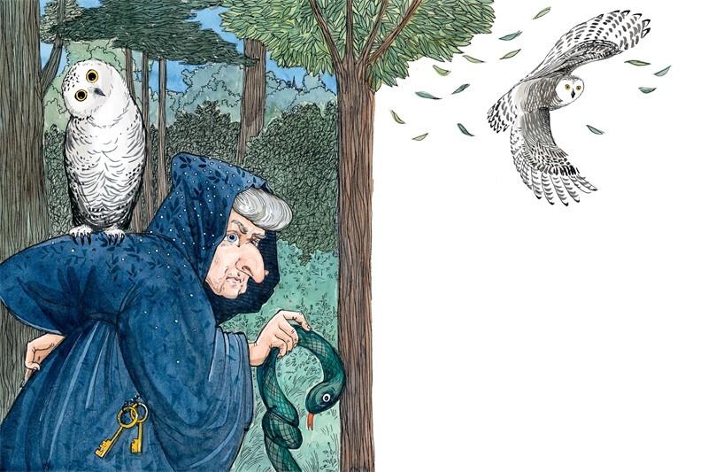 Королева, радуясь её словам, ушла. На другой день колдунья, невидимая всем остальным, явилась к королеве – та уже ждала ведьму, полная нетерпения. Колдунья, опираясь на клюку в виде змеи, заговорила: