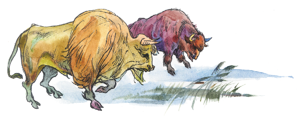 Иногда монотонность равнины нарушали невысокий холм, ложбинка, пруд, кишащий насекомыми и пресмыкающимися. Одинокая скала высилась среди моря трав, словно мастодонт на пастбище. Стада антилоп и сайгаков проносились в отдалении, в траве прыгали длинноухие зайцы; порой из зарослей кустарников показывались небольшие стаи волков и диких собак. Над саванной кружили вороны, журавли и дикие голуби, взлетали грузные дрофы и стремительные куропатки. По необозримому простору равнины скакали табуны диких лошадей и лосей. Степенно ступая, шли по краю горизонта громадные зубры. А однажды на пути уламров попался серый медведь, более свирепый, чем тигр, и не уступающий в силе самому пещерному льву.
