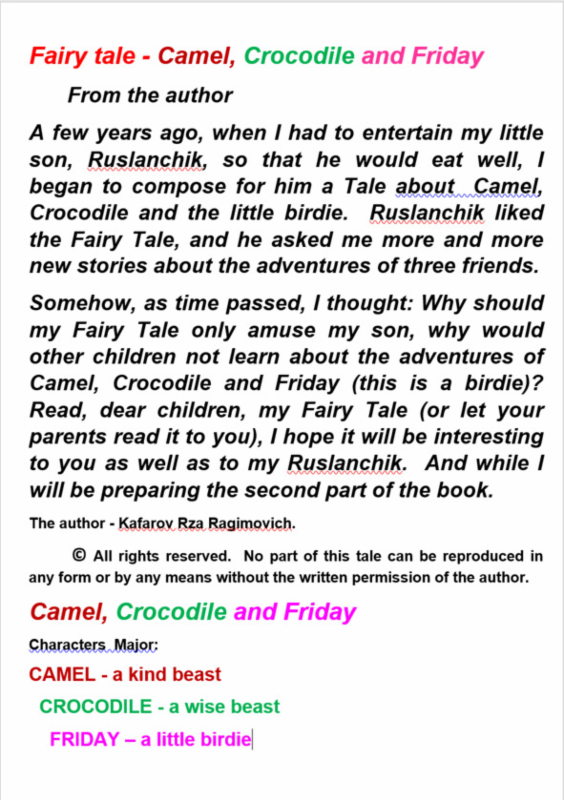 There is in our country a small town Achmas. Its inhabitants, ordinary citizens, in the evenings, after their daily labors, sat down on benches near their houses and had a leisurely conversation about this and that. Once, one of the oldest residents of Achmas called Ali-kishi mentioned that camels caravan came to Achmas in ancient times.
